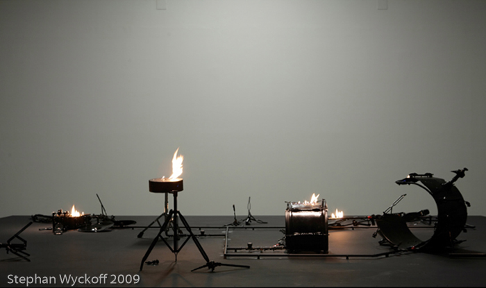 1. The drums on fire by Violette Banks, otherwise known as Not Yet Titled, seen in Vienna as part of the Elevator To The Gallows exhibition, and still wishing the gallery attendant had allowed me to photograph it, just the one, as my photograph would have been better than this, taken from the 'net. For a start, the walls were black, not grey, and there were giant concave mirrors, cracked and broken, at each end of the raised platform infinitely reflecting the burning drums.